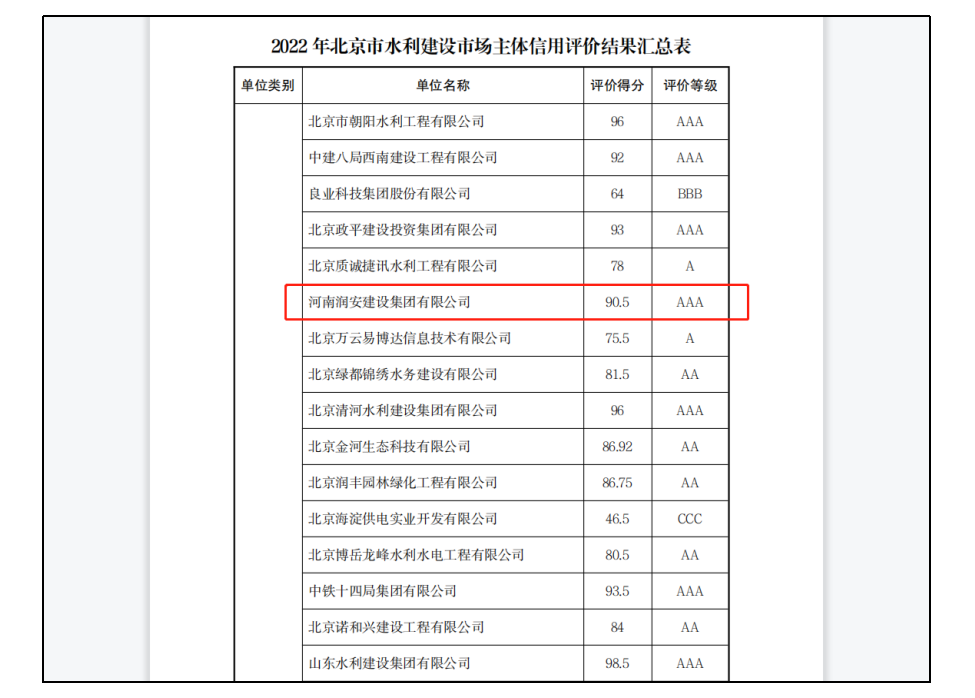 2022年12月22日,北京市水務(wù)局發(fā)布關(guān)于公告2022年北京市水利建設(shè)市場主體信用評價(jià)結(jié)果的通知,集團(tuán)公司以90.5的高分通過了此次評價(jià),獲得了高等級AAA級信用評價(jià),為集團(tuán)公司開拓水利業(yè)務(wù)打下了良好的基礎(chǔ)。
